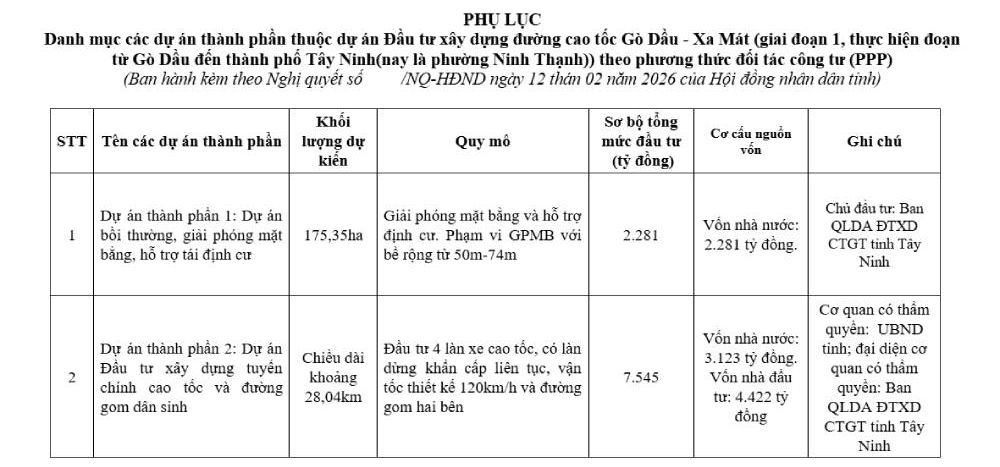 Theo nghị quyết, dự án xây dựng đường cao tốc Gò Dầu – Xa Mát (giai đoạn 1) được phân chia thành 2 dự án thành phần độc lập.